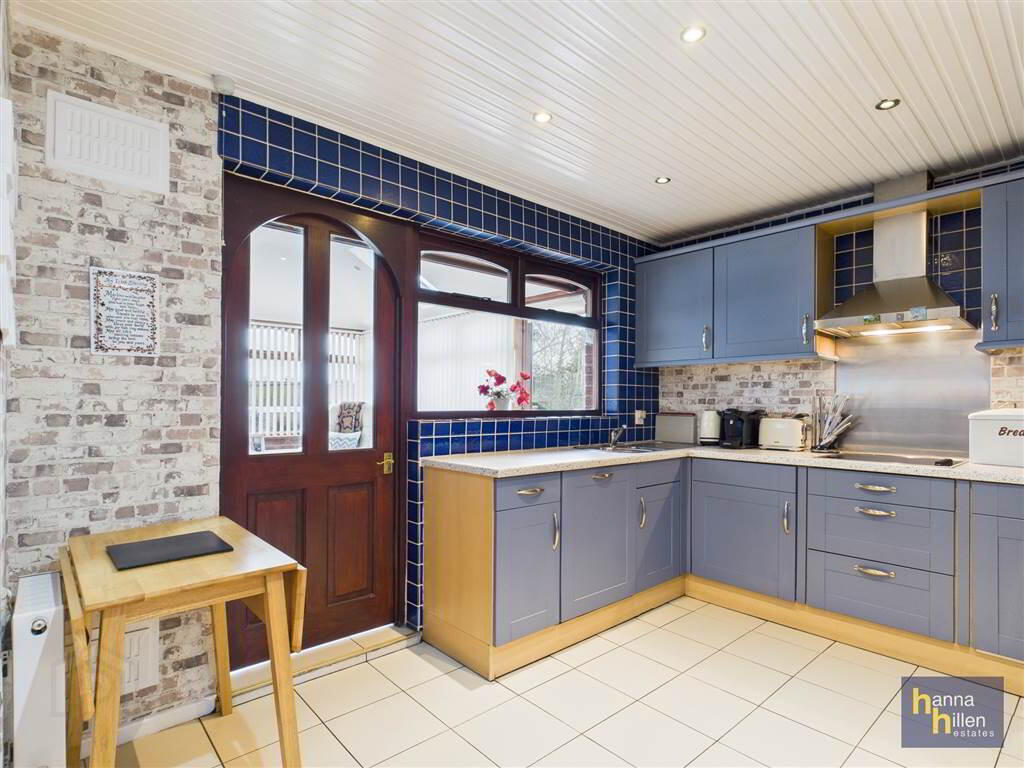 High- & low-level units, tiled between. One and a half bowl single drainer stainless-steel sink unit. Integrated hob & oven. Integrated fridge. Integrated dishwasher. Radiator. Tiled floor. - SUNROOM