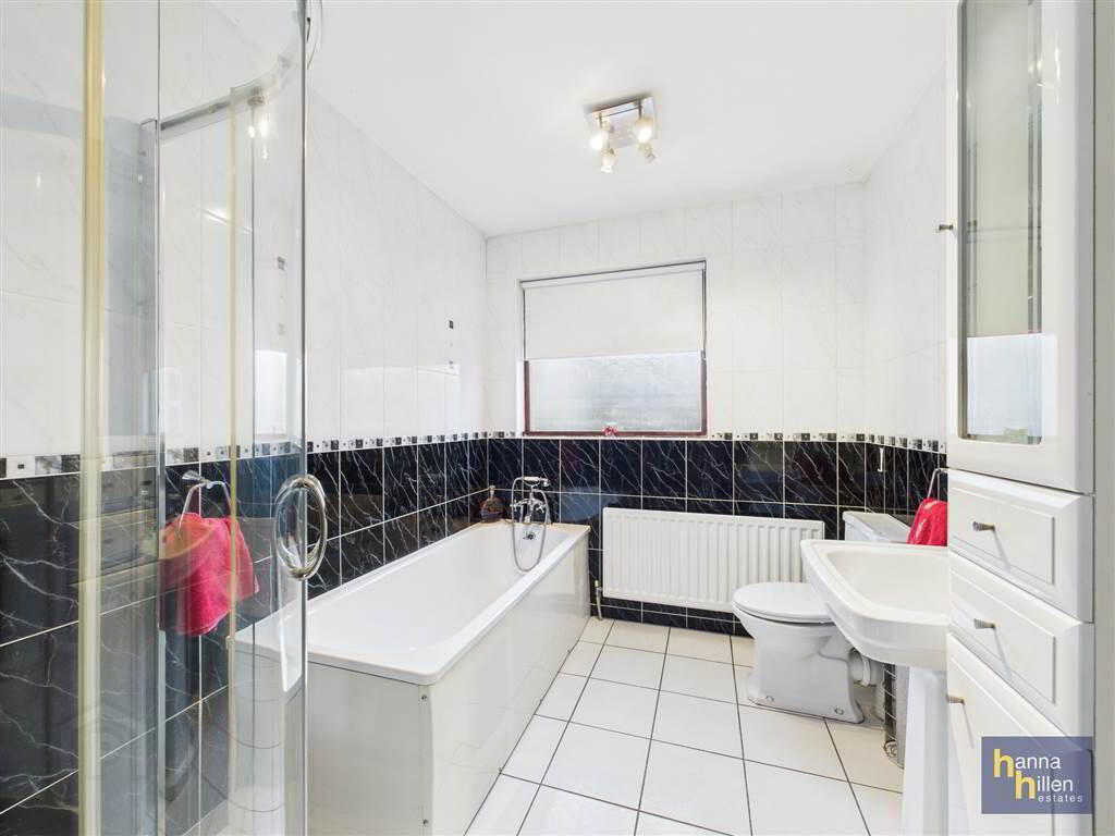 White suite. Tiled walk-in shower, Telephone hand shower over bath. Radiator. Tiled walls & floor. Vanity unit.