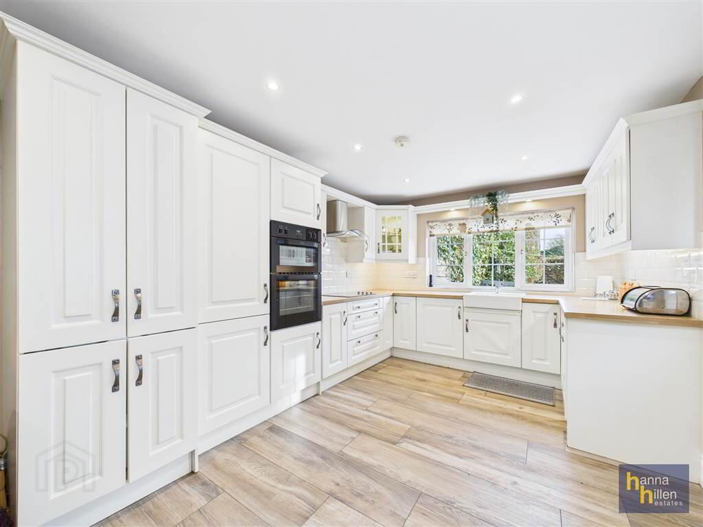 High- & low-level units, tiled inbetween. Integrated washing machine & dryer, integrated fridge freezer , integrated double ovens, electric hob & extractor fan. Belfast style sink. Tiled floor. LED downlights. Radiator.