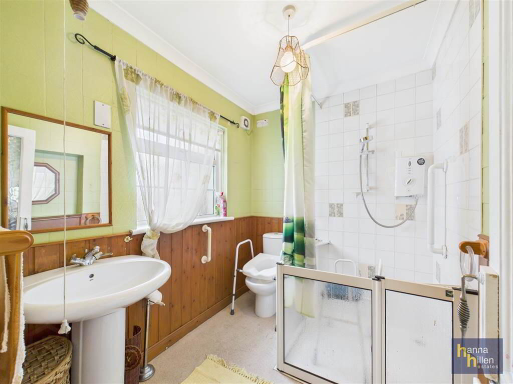 Lino flooring. Walk in disability shower. Electric shower. White suite (sink & toilet). Half panelled, half tiled walls. Radiator.