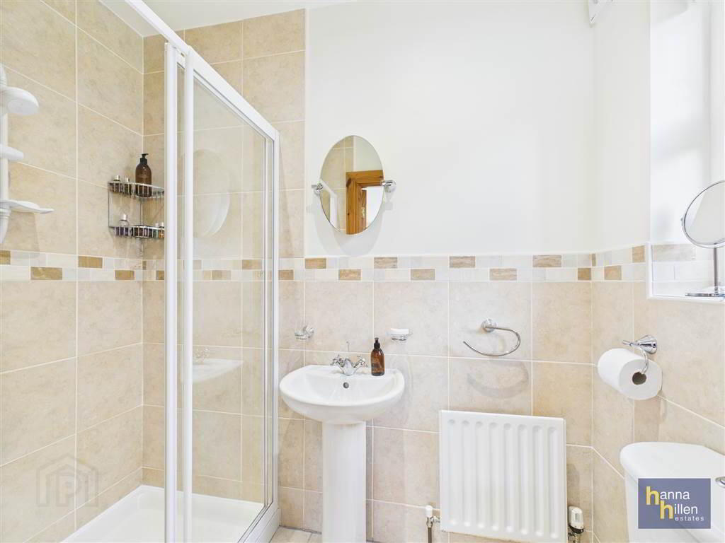 White suite. Tiled walk in electric shower. Recessed lighting. Radiator. Tiled walls & floor.