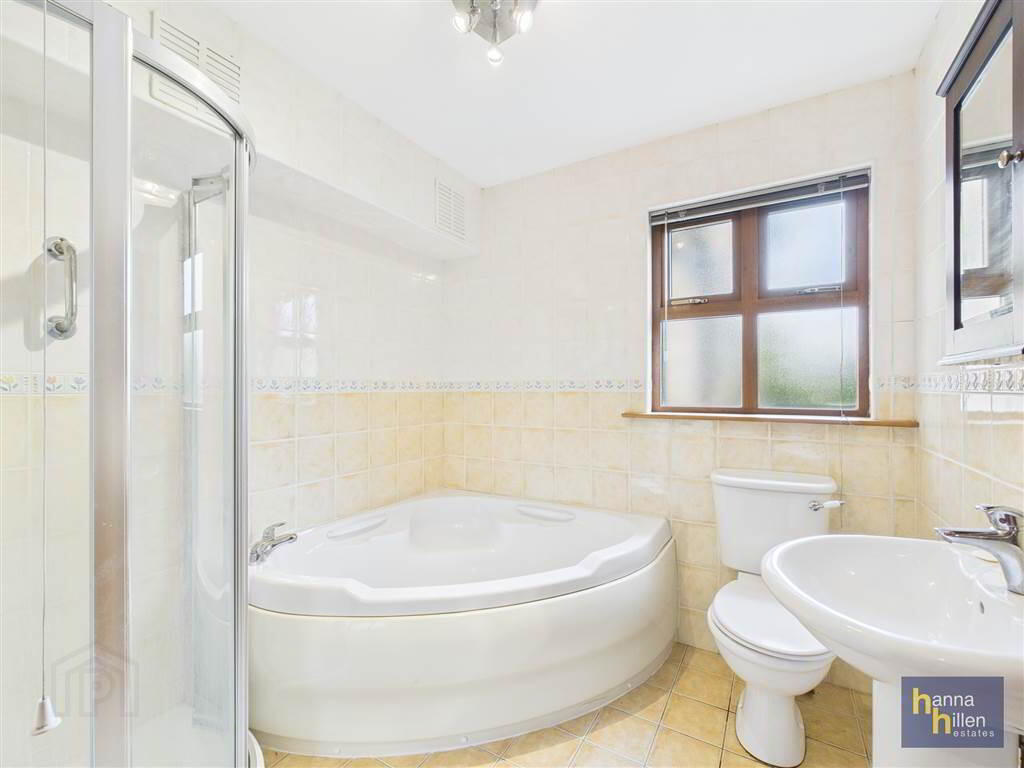 White suite. Corner bath. Tiled walk-in corner shower. Tiled walls & floor.