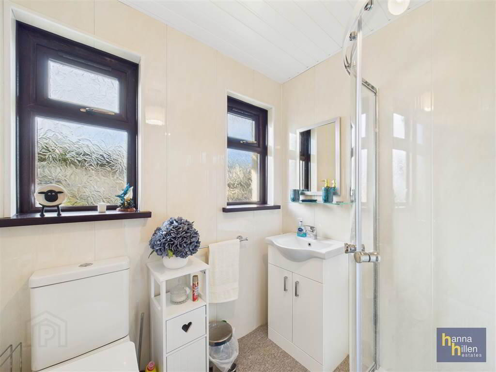 Carpet. Radiator. Walls and ceiling panelled (plastic). Shower tray and cubicle. Electric shower. White suite including sink and toilet.