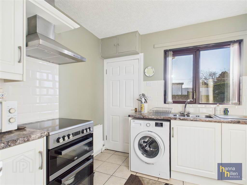 High- & low-level units, tiled between. One and a half bowl stainless steel sink unit. Extractor fan. Integrated fridge freezer. Plumbed for washing machine. Radiator. Tiled floor.