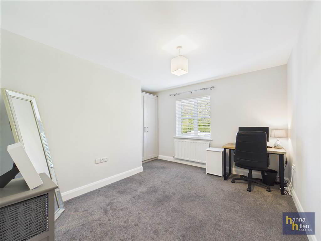Tiled floor. White suite (toliet & WHB). Tiled splashback. Mirrored cabinet over WHB. Large shower tray & cubicle (electric shower). Extractor fan. Heated towel rail.