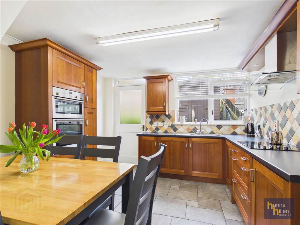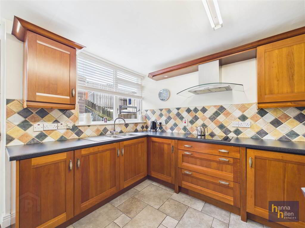 High & low level units, tiled between. One and a half bowl stainless steel sink unit. Integrated hob & double oven. Extractor fan. Integrated fridge freezer. Integrated dishwasher. Radiator. Tiled floor.