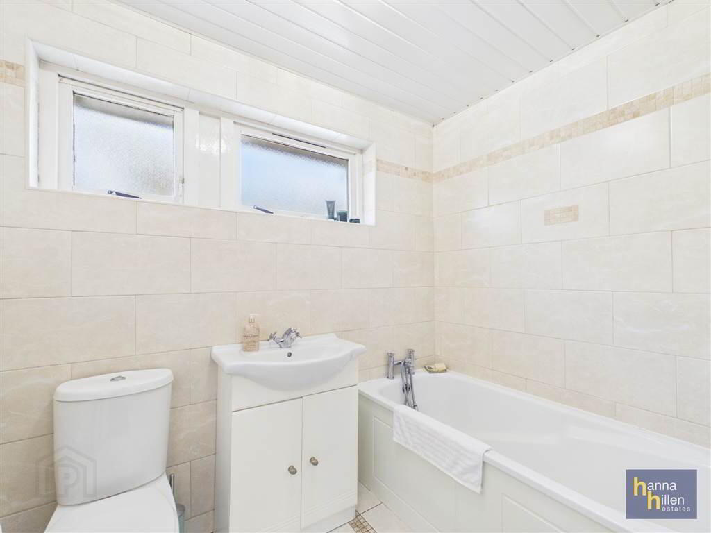 White suite. Vanity unit under sink. Hot-press, Tiled walls and floor. Radiator.