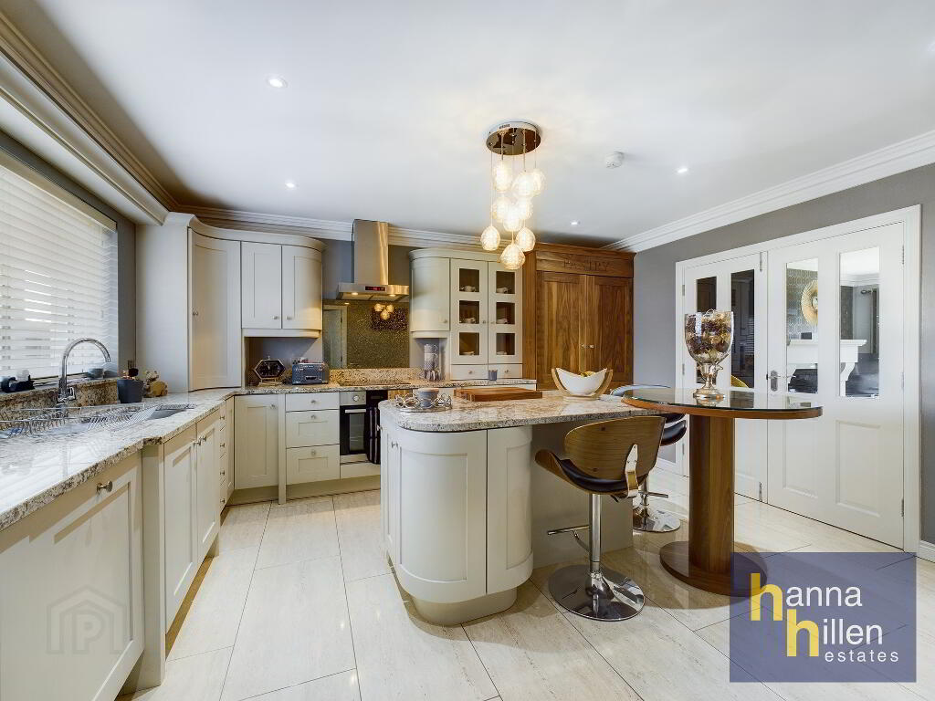 High & low level units. Window pelmet. Integrated electric hob & oven. Integrated extractor hood. Integrated fridge freezer. Integrated dishwasher. Marble worktop with glitter splashback. Island unit with breakfast bar. One and a half bowl stainless steel sink unit. Recessed spotlighting.