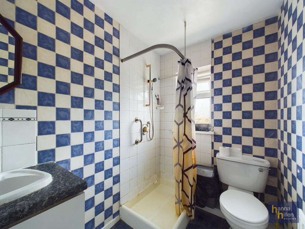1.52M x 2.29M – Vinyl flooring. Partially tiled walls. White suite. WC. Sink. Shower cubicle with electric shower.